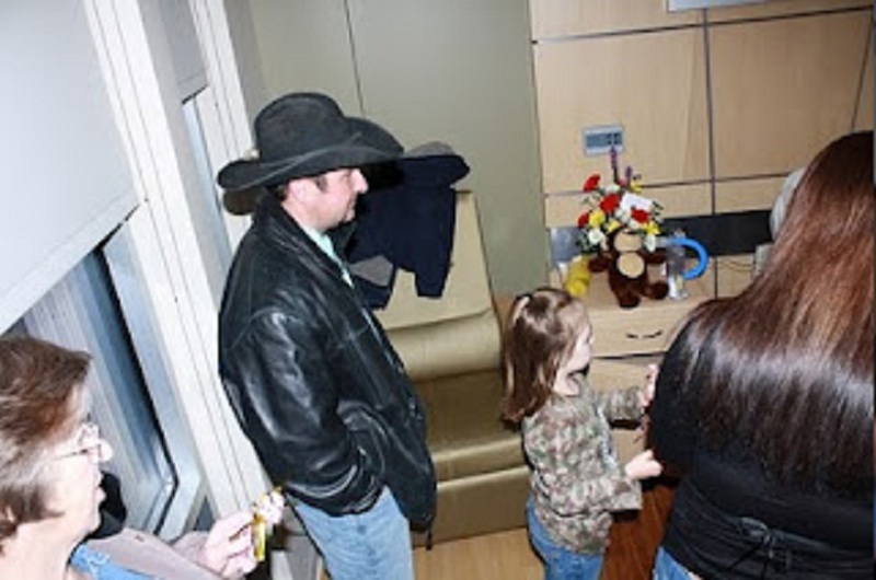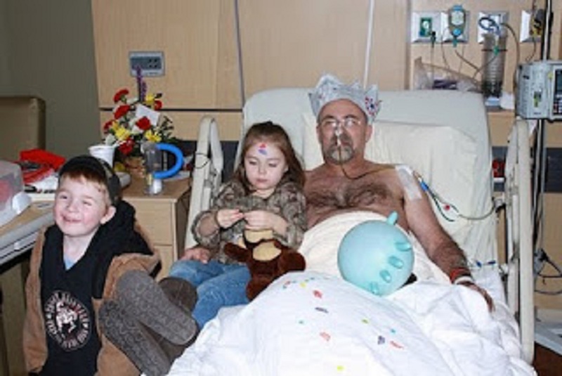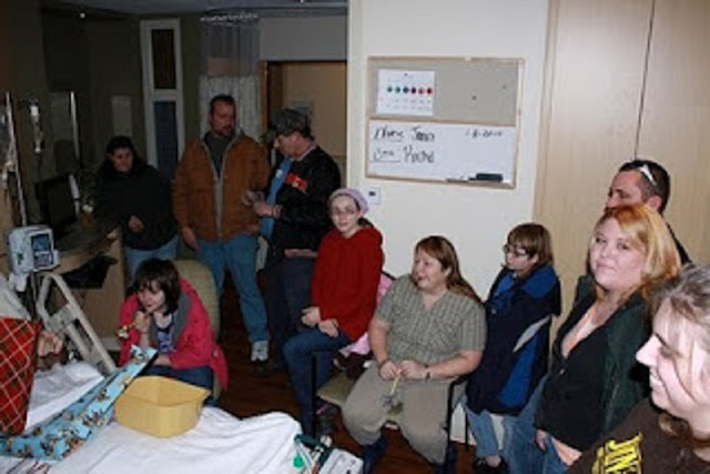 Prince Charming’s dad Marlin had his 61st birthday on Saturday. The sad part about it is, he got to spend it in the hospital. His appendix ruptured on Wednesday or Thursday. He went into the hospital on Wednesday night but Prince Charming and I didn’t find out until Thursday morning. After work, I went to the hospital and sat with Prince Charming and Liss (Mark’s sister) while Marlin went into surgery. Prince Charming’s cousin and his daughter showed up as well. They thought it was one of two things, a Perforated Bowel or appendicitis. I didn’t know about the appendix until I got to the hospital Thursday night. In fact, if Marlin saw I put some of these photos up, he might disown me… LOL so please don’t tell :). So yesterday (Saturday the 9th) was his 61st birthday. Prince Charming, Liss & I decided we should do something for him on his birthday, especially since he had to sit in the hospital so Prince Charming & Liss called some family members together, Liss got party plates & napkins and I made a cake and we went in to surprise him on his birthday. It worked out great. Marlin was up in the bathroom when Prince Charming and I got there around 4:45 so we put the cake and presents in an empty cabinet and sat there and talked as if nothing was going on. Everyone else gathered in the waiting room and waited for Liss & Jason to show up. Marlin saw my camera sitting on the counter and asked what I was up to and I claimed I didn’t want to leave it in the frigid temperatures sitting in Prince Charming’s truck and he believed me. whew, thanks for quick thinking there! So Prince Charming walked out of the room on the phone and when he walked back in everyone came in with him. Under the circumstances, I think this was a great birthday! Here are a few photos and here’s where Marlin might disown me… 🙁 sorry, Marlin.