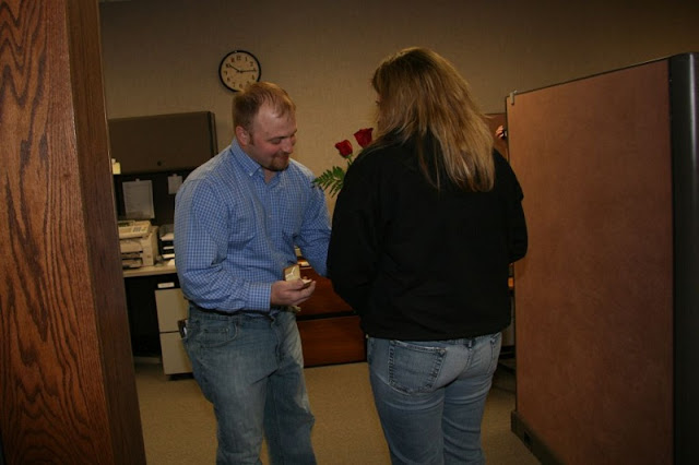 So when I came back Becky announces really loud that I had beautiful flowers. My desk has frosted glass around it and when I walked around the corner and I could see someone on the far side of my desk but I figured it was a coworker had dropped something or since I was having such a bad day, they were going to jump out and scare me (things like that happen to me from time to time) so I didn’t really think too much of it. So I came upon my mystery guest and Prince Charming is down on one knee.