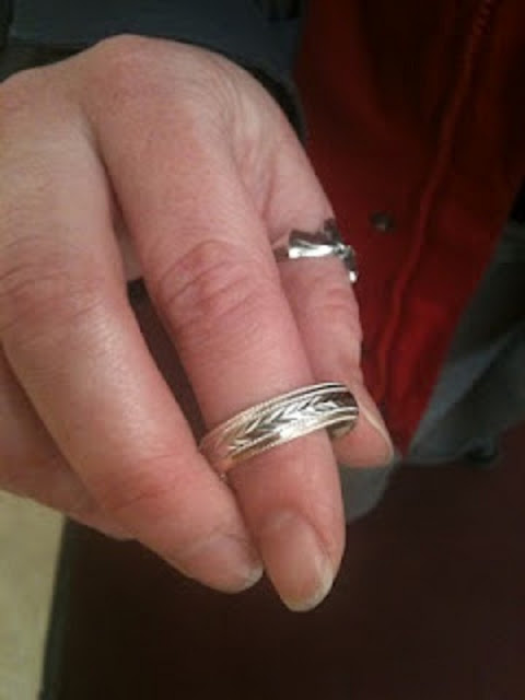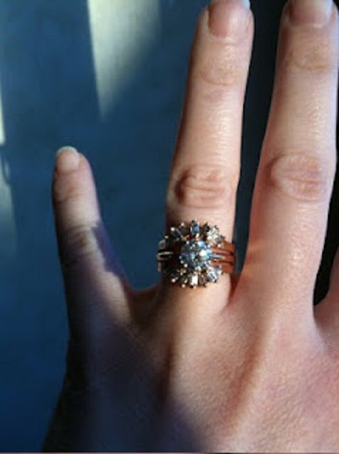 Here’s Prince Charming’s ring. The photo doesn’t do it justice, it was just snapped with a phone so we could email the photo to my mom so she could see. (Yes it is on my fingers in this photo)