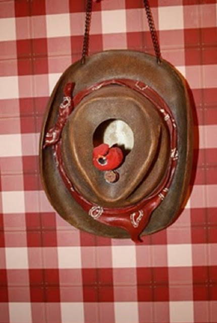 Christmas 2006 I was at Hobby Lobby and saw this cute cowboy hat ornamental birdhouse. Well, I thought it would go great in my mom’s cowboy bathroom and ornery me decided to wire a red bird on the perch. I wrapped it so when she opened the box, that was the first thing she saw. The funniest part, after 4 years the birdhouse is up and the bird is still on it.