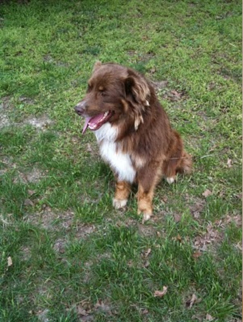 So Jeff was telling us where he got the dog and I just crack up laughing. Of course, that gets a weird look from him and Prince Charming and I told the story of this dog. My dad had a female that was a blue merle named Cactus. She had a litter of puppies and my dad’s cousin got one of the puppies. So Adrian’s dog had a litter of puppies and Jenny & Sam got one from her litter. Well, Bear is out of Jenny & Sam’s female. Oh, but it gets better. A few years ago I had a huge red merle Aussie named Max. I had to find a new home for Max (he got in and killed some of my sheep) so he went to live with Jenny & Sam. So Bear is an offspring of Max and a grandson of Cactus so our Aussie bloodlines made a full circle back to us.