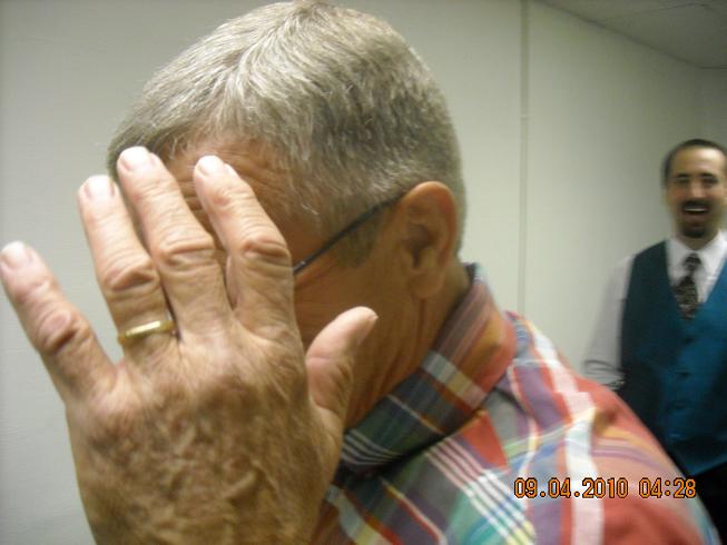 One of the surprises I didn’t and couldn’t tell you about (b/c PC reads my blog religiously) was that I had 3 cards. I had bought them years ago. They each had meaning but at the time I bought them, I wasn’t even dating anyone, I just felt the need to buy them, so I did. I put them in a box and put them away. A couple weeks before the wedding it finally dawned on me why I bought these cards and what I needed to do with them. I signed each one and labeled them with times. One was to be delivered to him at 8am, one at 9am and the third which also contained a personal letter from me was to be delivered at 10am. I gave them to my mom and put her in charge. I didn’t care who took them to him as long as he received them in the particular order I sent them and that he opened them right then and there and read them. Here he is reading one of his cards.