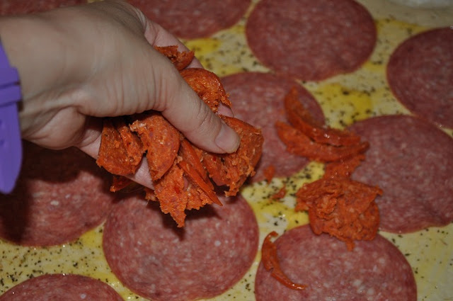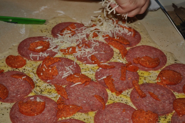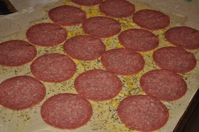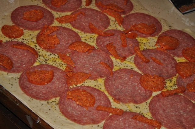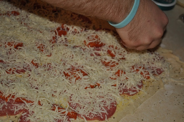 4.  Next layer pepperoni and cheese.  {we also decided to put in some Hard Salami at the last minute}