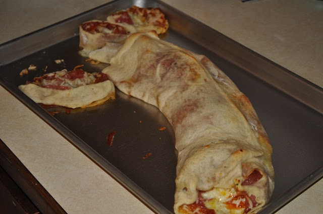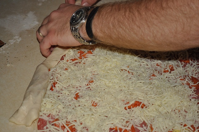 6.   Slice off 1 inch rolls and put in greased 9×13 pan.  Bake at 350 degrees for approx 12 mins or until browned. {which didn’t wind up working so we baked in a log like the Stromboli}