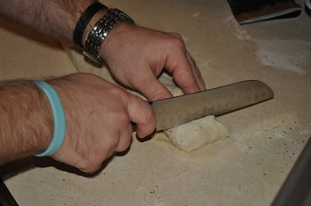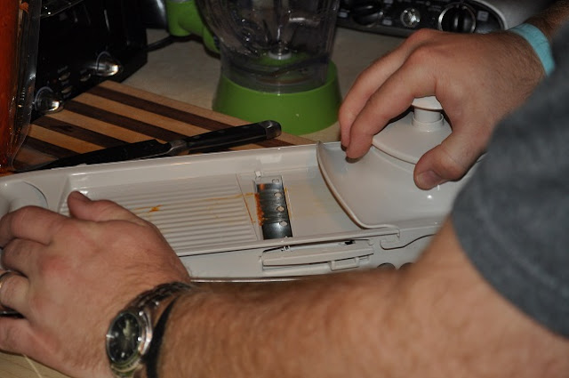 3.  We bought our pepperoni in a log so we had to pull out the mandolin and slice it up.  But we used the wrong blade so we had chunks 🙂