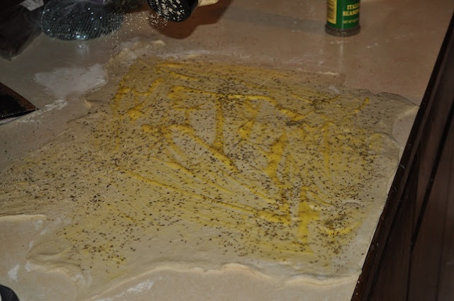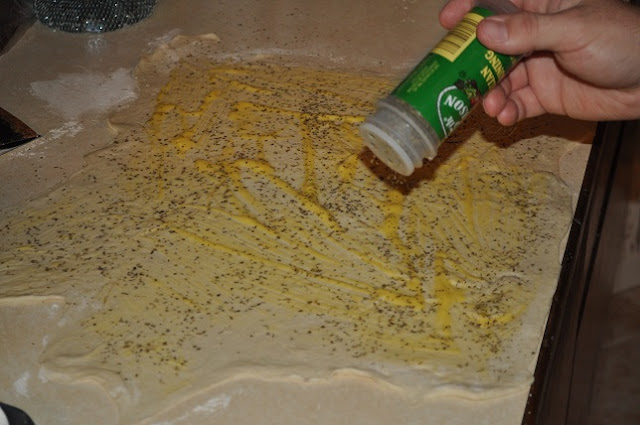 1.  Roll dough out into a rectangle.  Melt butter and spread over dough.