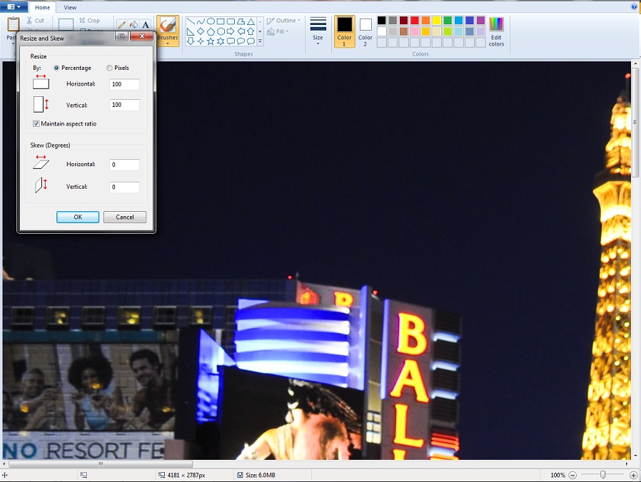 Resize & Skew. Here you can click percentage (which is usually what I use) or if you know the pixels you are looking for (some digital photo frames tell you the size) you can select the pixels. Right now you’ll notice “Maintain Aspect Ratio” is selected. In Windows 7 if I type in 20 on Horizontal, it automatically changes the Vertical to 20. In old systems, you had to manually change both numbers. That Maintain Aspect Ratio works the same way with Pixels. It keeps it in the same ratio as the original photo was taken. (that way you don’t make one direction real wide and one skinny!)