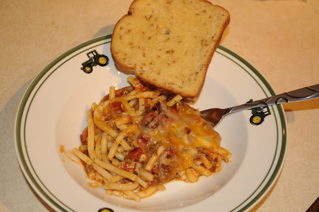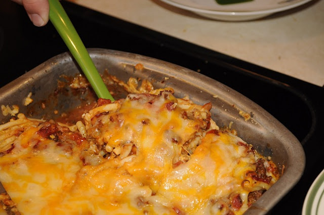 A few weeks ago my {step}daughter stayed longer than normal. I heard one time that her favorite meal was lasagna. I’m not sure, she’s never personally told me that, it’s just something I heard her mom tell my husband. Anyway, the day before I browned up some hamburger for French Bread Cheeseburger for Sunday Night Dinner, but then when SND got changed to our house for a pool party and I needed more than just the pound of ground beef so shhhh don’t tell but I used 2 lbs of ground deer burger. No one knew…. well until now…. Anyway I had this pound of ground beef sitting in my fridge I needed to use up so I decided to make Paula Deen’s Baked Spaghetti. It takes a bit of time to make, so I figured on a lazy day I’d do it up, cool it off and place it in the fridge. Then the next day we baked it off and dinner was ready!