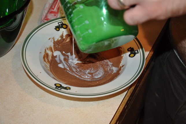 - Chop the chocolate into small pieces and place it in the top of a double boiler over simmering water, stirring occasionally until melted. Add the hot chocolate mix and sugar, stirring constantly until thoroughly blended. Remove from heat and slowly add 1/2 cup of the milk and stir until smooth. Cool to room temperature.