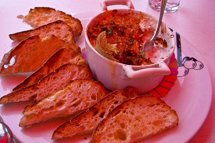 Crab Artichoke Dip – Luscious Creamy Maryland Jumbo Lump Blue Crab and Artichokes topped with Melty Cheese and served with Ciabatta Toast Points.