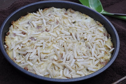 Transfer to a shallow casserole & bake until golden & bubbly at edges, 15-18 minutes. Top with almonds.