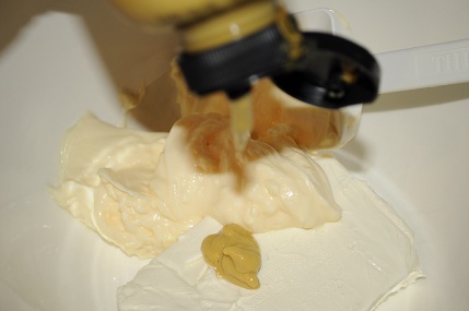 In mixing bowl combine cream cheese, mayo, Dijon,
