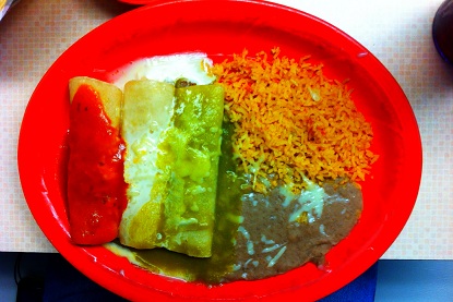 Enchiladas Mexicanas – 3 enchiladas 1 chicken, 1 beef, 1 cheese served with rice and beans