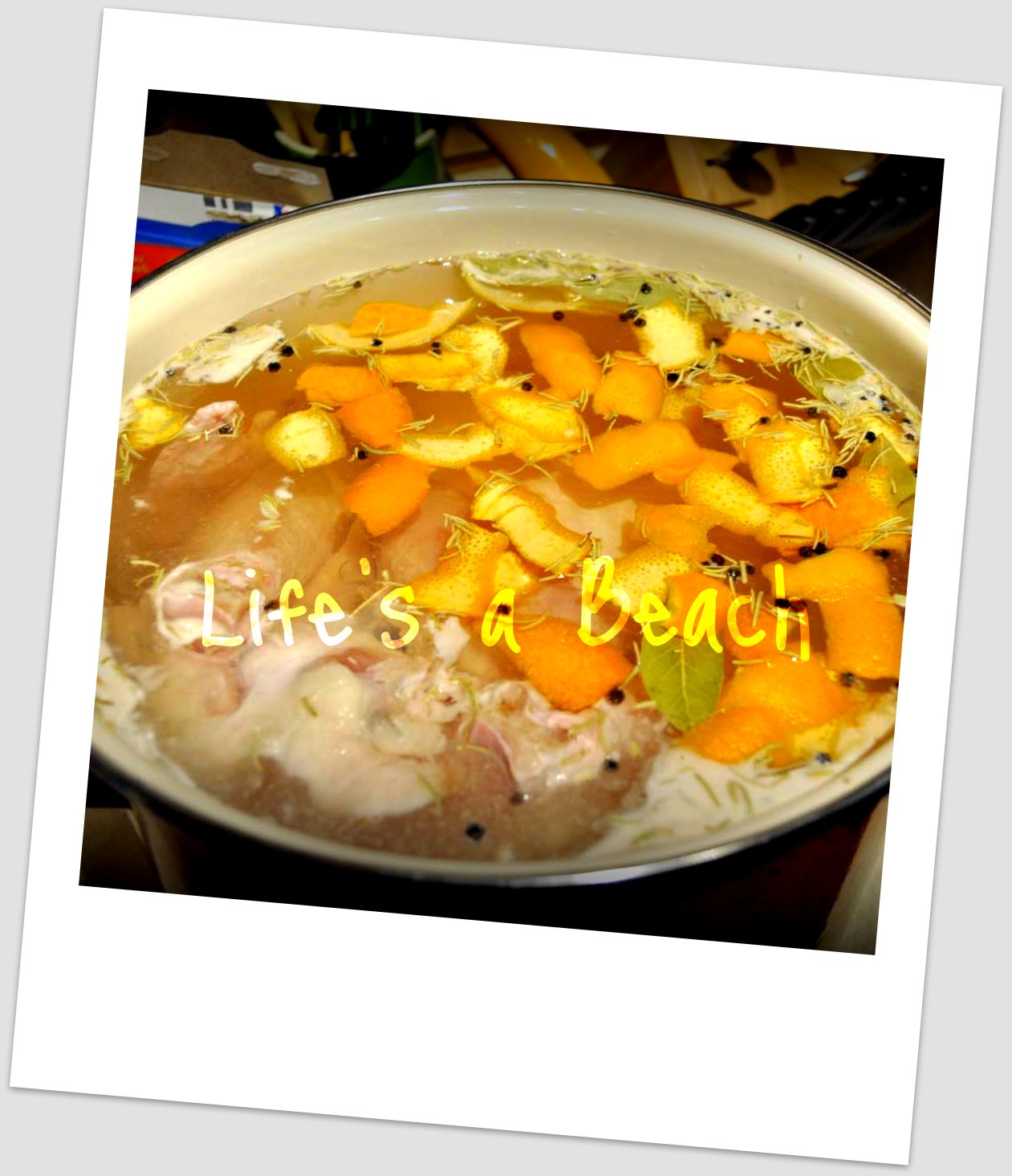 Combine the water, apple juice, salt, sugar, garlic, bay leaves, peppercorns, dried rosemary, and orange peel in a large pot and bring to a boil. Turn off the heat immediately, cover, and allow mixture to come to room temperature. Cool mixture in the fridge until you’re ready.