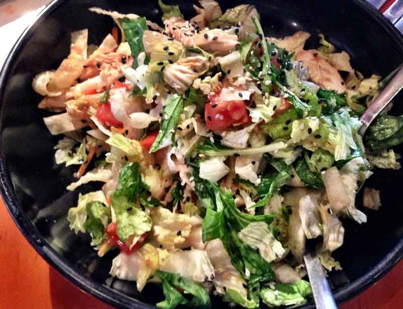 Sliced chicken, assorted lettuce, Napa cabbage, carrots, Thai basil, tomatoes, crispy wontons, toasted sesame seeds, sesame ginger vinaigrette