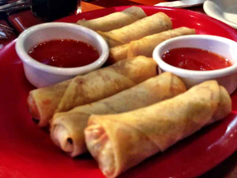 Pork, Napa cabbage, black mushrooms, carrots, scallions, rolled in a crispy egg roll wrapper