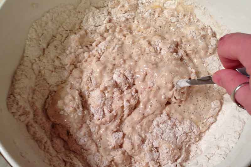Turn onto a floured surface and knead lightly.  Roll the dough out to a 1/4 inch thickness.  Slice into diamond shapes and about 3 inches long.