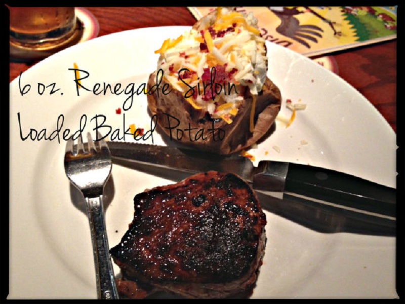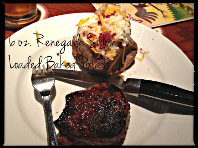 It was good, but I could kick myself in the butt (literally) for not choosing what Hubby got. When it came to being cooked right, they got that down. A perfect Medium Rare. Mine came with a side as well and I went with the loaded baked potato. At first I started to be good and go green beans, but at least my potato packed punch! Butter, sour cream, cheese & bacon.