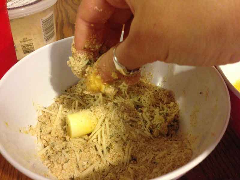 Mix your bread crumbs with the Parmesan cheese. Season with salt. Dip your egg coated Mozzarella cheese stick into the bread crumb mixture.