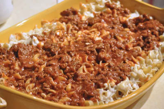 Top with half the meat mixture, then sprinkle on half the grated cheddar. Repeat with noodles, meat, then a final layer of cheese. Bake for 20 minutes, or until all cheese is melted.
