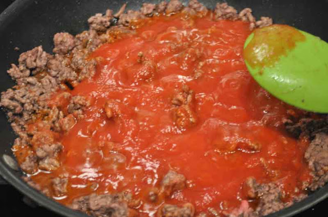 Brown ground chuck in a large skillet. Drain fat, then add tomato sauce. 1/2 teaspoon salt and plenty of freshly ground black pepper. Stir, then simmer while you prepare the other ingredients.