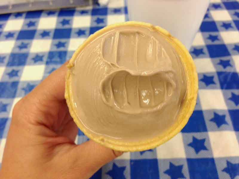 Then came the Ice Cream.  Now AL, Zebra Girl and JT all raved about the ice cream.  Here is Earl delivering our ice cream cones.  This, believe it or not is the kids size.  There are the options of Peewee, Baby, Kids, Small, Medium, Large.  I know for sure the Medium & Large are served upside down with the cone on top and in a bowl.  You’d have to be really hungry!  I saw one!!