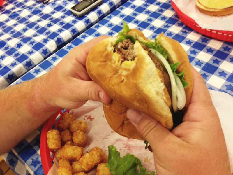 I ordered a Jr. Burger with Cheese and Bacon added topped with Mayo, Lettuce, Tomato and pickles minus onion.  There were about 10 pickles so I had to remove a few and there were 2 pieces of tomato which I only ate one.  That’s ok, TB ate the other one :).  I went with a side of tator tots.  Might I tell you this burger was delicious.  I was a bit skeptical at first, just going here not knowing but HOLY COW was this a GREAT burger!  My Jr. Burger was a 1/3lb burger.  I shared my tots with Waldy.