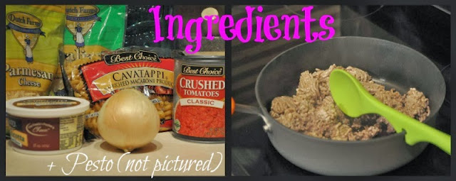 Needed: Pasta, 28oz Can Italian Crushed Tomatoes, 1 Cup Ricotta Cheese, half a small onion, 1 Cup {store bought} Pesto, Italian Cheese (I used 2 cups), Parmesan cheese (I used about a cup). Plus I had some hamburger that needed to be used up so I decided to throw that in.