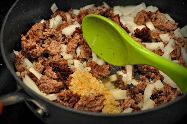 Brown up the hamburger, sweat out the onions and cook up the garlic.