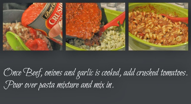 Once your beef mixture has cooked up, add the crushed tomatoes. I could only find original so I added in my own Italian seasoning and a handful or so of dried basil seasoning. Mix it all together and then dump on the pasta and mix again.
