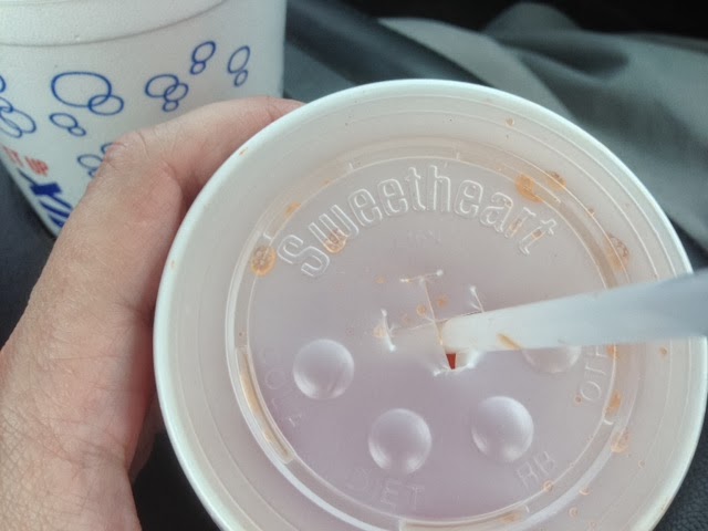 When we went to leave, hubby refilled his drink and got a lid/straw. As we were walking out of the building he kept saying Sweetheart and confusing the heck out of me. Sadly, to say I was getting annoyed is a bit of an understatement because originally I was answering him like he was calling me sweetheart.