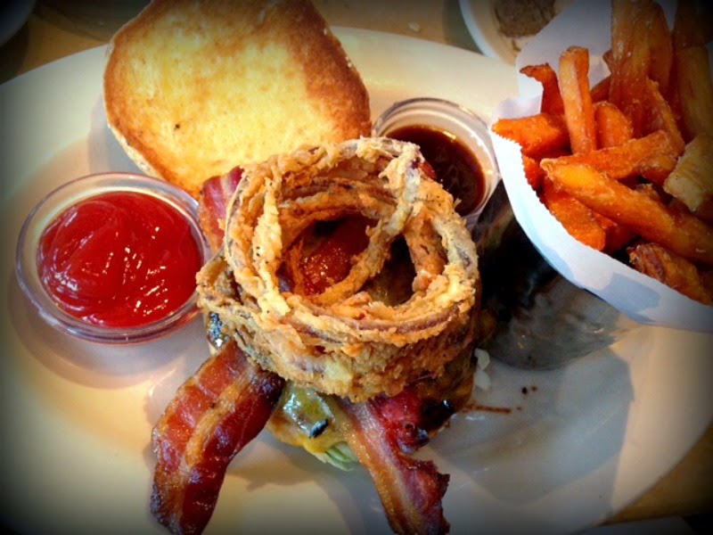Hubby decided to go with the Smokehouse BBQ Burger (from the Glamburger menu!). Smoked bacon and melted cheddar with crispy onion rings and BBQ Ranch sauce with a side of Sweet Potato Fries. He got his burger Medium well and that was very good. Still flavor but cooked just right. YUM! And the Sweet Potato fries were good too.