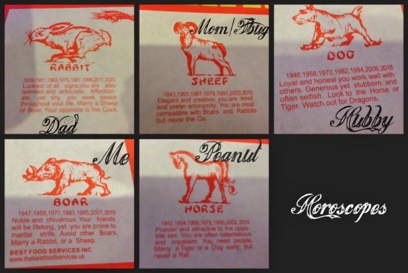 The menu showed the different animals applied to the year you were born. I took pictures of the family’s animal. Mom and Tbug shared the sheep.