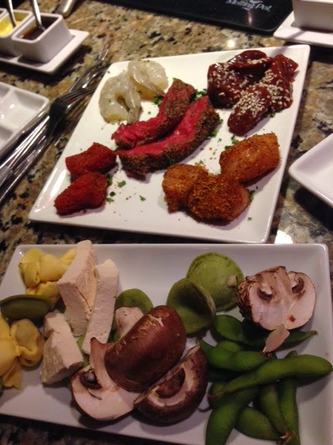 Then we chose our entree. Now I’m still having issues eating steak so hubby went The Classic which had Certified Angus Beef Sirloin, Memphis style BBQ Pork Medallions, Pacific White Shrimp, herb crusted all natural Chicken breast, and teriyaki marinated Sirloin. The chicken and pork was awesome in my opinion. I tried each steak but dang it, steak just really isn’t doing it for me, it’s all Peanuts fault. Hubby loved the steak, especially the teriyaki marinated sirloin. The joke was I went for the Vegetarian option, simply so we’d get vegetables as well. Very seldom will you ever hear me do that… lol. Mine came with edamame, Portobello Mushrooms, and asparagus served with Thai peanut marinated Tofu (never had tofu before this), spinach and artichoke ravioli, and wild mushroom sacchetti. Oddly enough the tofu wasn’t half bad.. although it had a weird texture in my opinion. The ravioli and sacchetti were awesome. The mushrooms were fabulous and that’s all I tried. I didn’t do an asparagus, but hubby did.