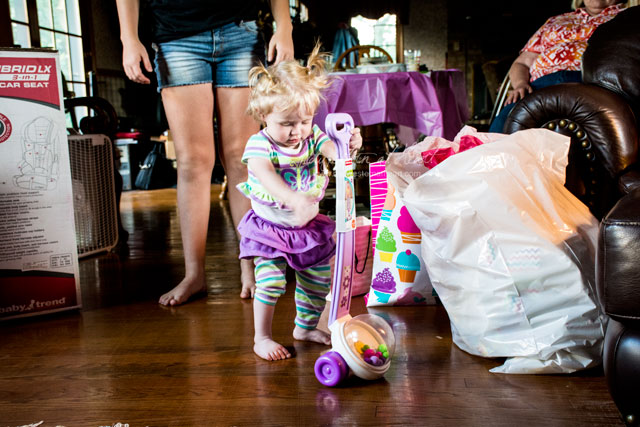 All the presents went into the corner to wait until after dinner. I think baby girl knew something was going on because she wasn’t real crazy about eating. I had Tbug help her open presents when it was time. I almost think we had more fun with her presents than she did. Hubby took them all out of their packages and she bounced around to the different toys we were all playing with.