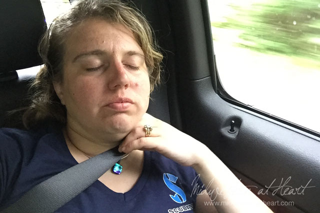 I didn’t really sleep the whole way home though, but it was a hot day and the heat got to me. I went and crawled on to my parents couch and went to sleep. I don’t really remember crawling on the couch but woke up cold in their house and I never think their house is cold. Heat must have gotten to me. I kept on squirrel girl to stay hydrated though! I guess that’s the mommy instinct in me coming out.
