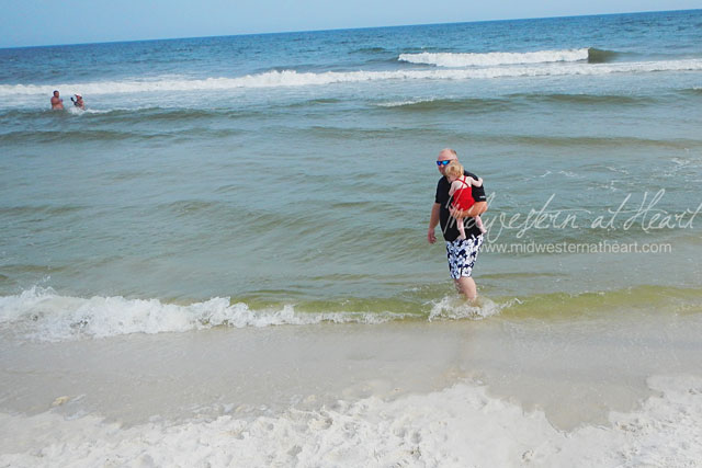 This was her first trip to the ocean. Sadly that storm made the waters yucky. They weren’t the pretty turquoise color and there was a lot of seaweed and jelly fish at the shore. I’m pretty sure Tbug and I were both stung within 5 minutes. Hubby even got stung. It wasn’t fun so we didn’t take Abug out in the water all that much. But yes, she did get in the water. Um… she was at the ocean… she had to. It’s the law… ha!