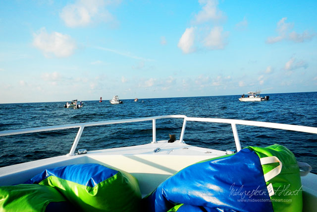 Dad, Tbug and I decided to ride on the front of the boat. The guys told us that it was the bumpiest ride. We were ready for it. In the bay, Tbug was like, this isn’t so bad. Once we got out though, it was a bit choppier. Hubby, Tbug, and I took Meclizine though just to make sure we didn’t get sea sick. We heard them talking on the radio that one charter had 9 people on board and 7 of the 9 got sea sick and they had to abort the fishing.