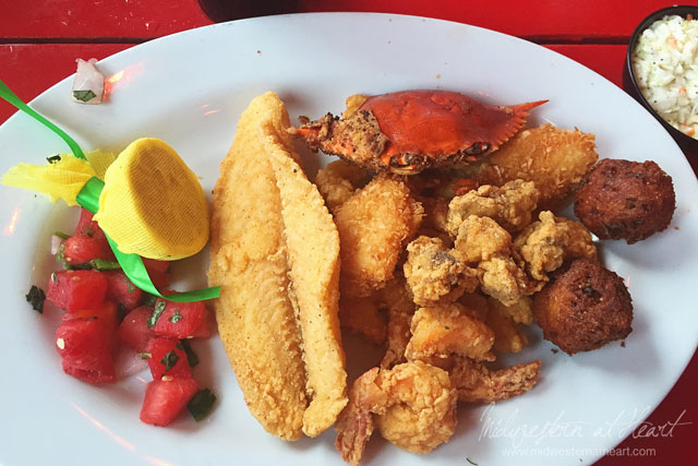 Hubby went with the Southern-Fried Seafood Platter. It had Fried Gulf Shrimp, Coconut Shrimp, Oysters, Fish, Popcorn Shrimp and a stuffed crab garnish. He was in seafood heaven. I tried the hushpuppy, a coconut shrimp (I don’t like coconut shrimp) and some other bite he said, here try this.