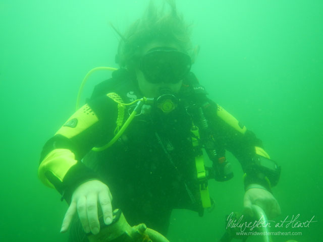 Friday was an extremely awesome day to dive. Not many divers were there and visibility was good. Karen, Jared, Hubby and I all got geared up and went down to hang out on the 15′ platform for a bit and then go for a shallower dive. My camera only goes to 33′ so we had to stay above that. Eventually we wound up on the other side of the cove and came up. I ditched the camera, got a hood, swam both directions on the surface across the cove, walked up and down the hill twice and went back for a dive. I was exhausted by the end of the day.