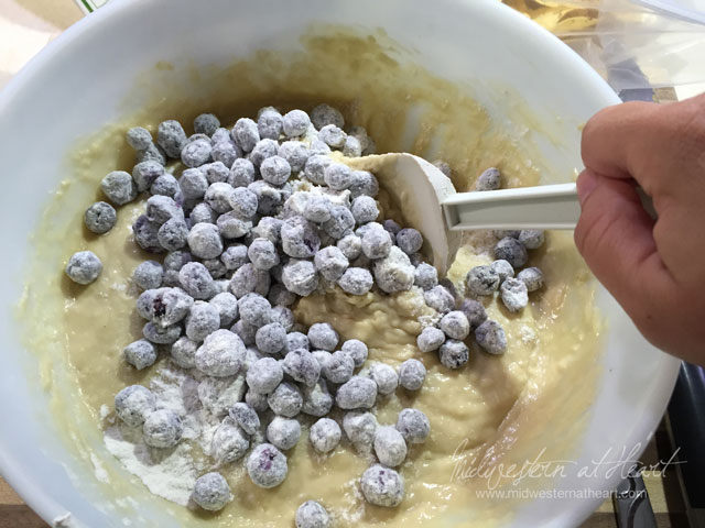 Note: To keep the blueberries from sinking to the bottom of the muffins, if you coat them in some flour before adding into the mixture, it helps them to stick to the batter a little better and spread more evenly through the mixture. (Don’t ask me why, I don’t know I just know it works.)