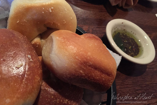 When we entered we were seated with menu’s as well as bread and dipping sauce. The bread almost reminded us of pretzel type bread. The first batch was a little over done but the second batch we got were pretty well almost right on the money. The dipping sauce was Extra Virgin Olive Oil, with seasonings and what tasted like balsamic vinegar.