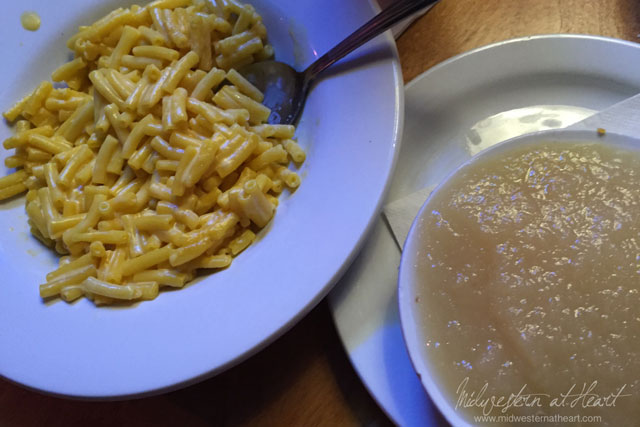 Abug went with Mac and Cheese and Apple sauce, eating steak off my plate and mom’s plate.