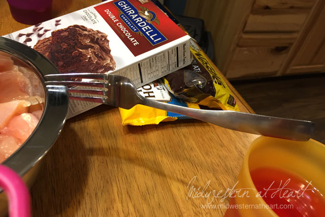 Now we had plans to do a chocolate fondue for dessert and dip blueberries, bananas, rice Krispie treats, and brownies in. We got the brownies made but that was the extent of it. So we ate brownies for dessert.
