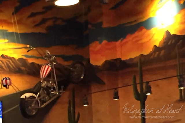 If you’ve never been there, the decor is pretty friggin awesome. There is a disco “ball” saddle. A motorcycle that looks like it is driving down a road (that is painted on the wall) and a painting of Toby Keith along with a bus driving through the wall (just the front) and tailgates made into seats, and and and and.