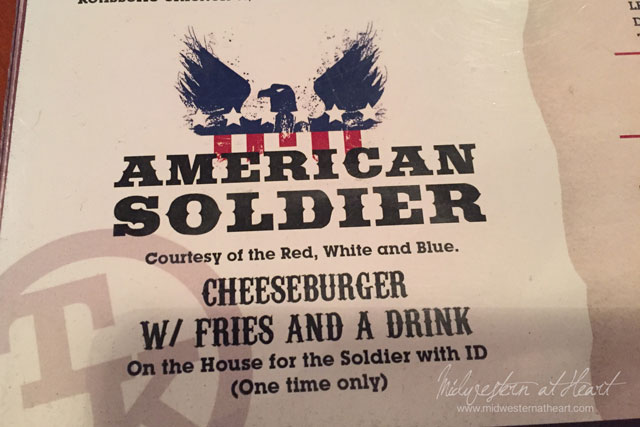 If you don’t know much about Toby Keith, he is a huge supporter of our American troops. So I love that this is an option on the menu.