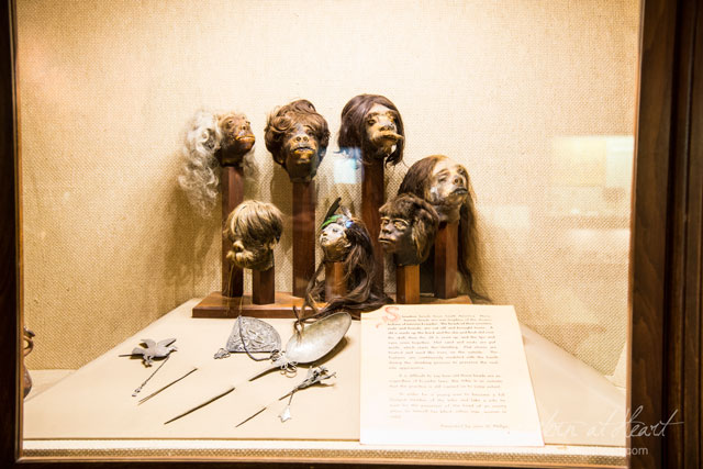 These are miniature heads. Supposedly from South America, they were shrunken down and they were trophies.