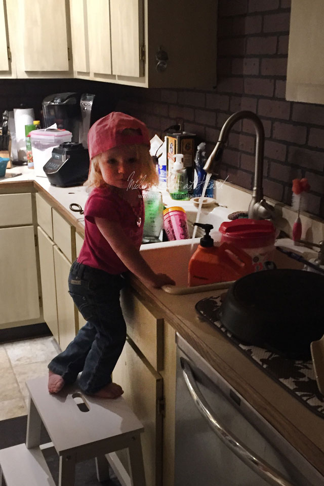 225/365 – They say if you don’t hear them, be leery… I walked to the other side of the house and heard water running. I came back to the kitchen with short cake, hat on backwards, standing on her step stool, playing/washing her hands in the water. I just laughed.