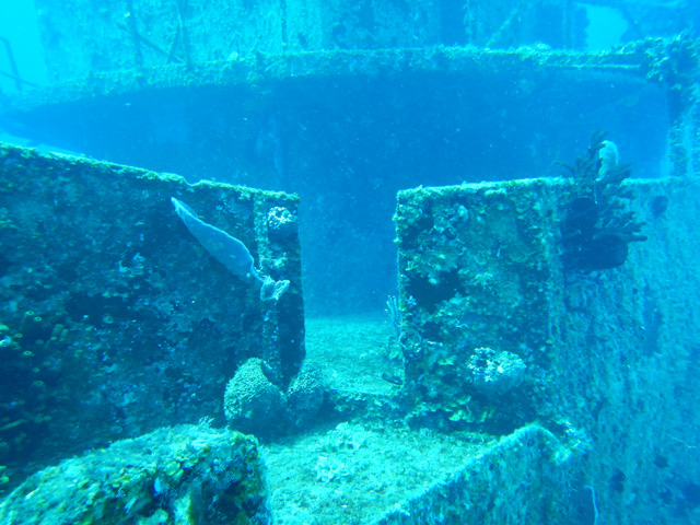 Our afternoon dive was to head to the Wreck to check it out. Jared said he remembered when the wreck was put down back in 1999. It was the Felipe Xicoténcatl or C-53. It was sunk in 82 feet of water. He said he could remember that you could see the tile and there were still toilets. A lot of people liked to have their picture taken on the toilet while diving. I guess they weren’t still in there when we dove it. Grady said that when one of the hurricanes came through it actually broke the ship in 2.