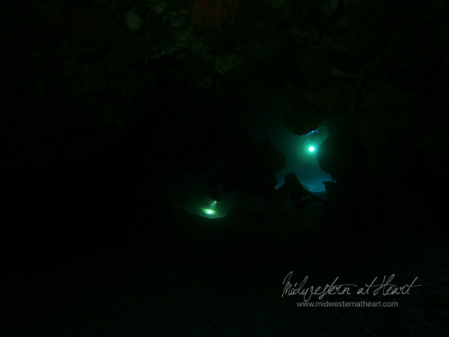 Our first dive of Friday was Devil’s Throat. It is a tunnel that starts out at 90 feet. When you come out you’re between 125 and 135 depending on if you come out toward the top or bottom (is what Grady said). Hubby really wanted to do Devil’s Throat but at the last minute decided he shouldn’t. (he’d gotten sick the day before and getting down that day he didn’t feel great. It is always best to call a dive before making yourself sick). I had talked myself in to doing it (even though I was nervous) until I had issues. We fought some current getting down, then my mask fogged over, and I lost Deb & Jared who were the two I was following, so I stayed with the group that went up and over Devil’s Throat. So these pictures are from those that actually went under. I didn’t have my camera with me as the depth is 100 feet and if I’d have done Devil’s Throat I’d have succeeded that… so look at Devil’s Throat at Punta Sur.